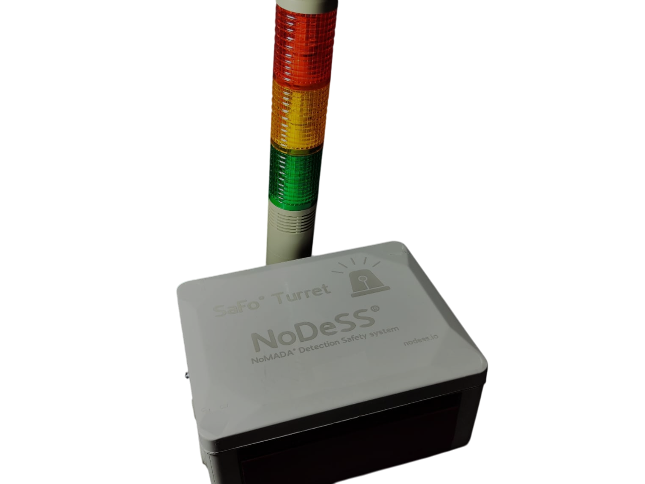 • SaFo® Turret es un dispositivo autónomo que detecta vehículos con sistema SaFo® y emite alertas visuales y sonoras en tiempo real, ideal para prevenir colisiones en zonas con puntos ciegos o tránsito mixto.