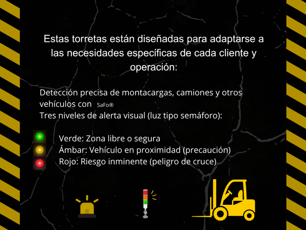 SaFo® Turret es una extensión avanzada del sistema SaFo®, diseñada para elevar la seguridad en zonas de tránsito mixto. Requiere detección previa en vehículos con SaFo® y activa alertas visuales y sonoras en tiempo real, fortaleciendo los protocolos de prevención en planta.